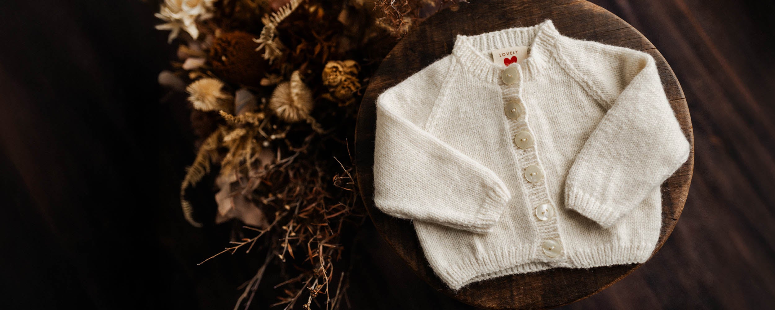 Our collection of handmade baby knitwear is crafted from the finest natural New Zealand merino wool, chosen for its softness, breathability, and sustainable qualities.
